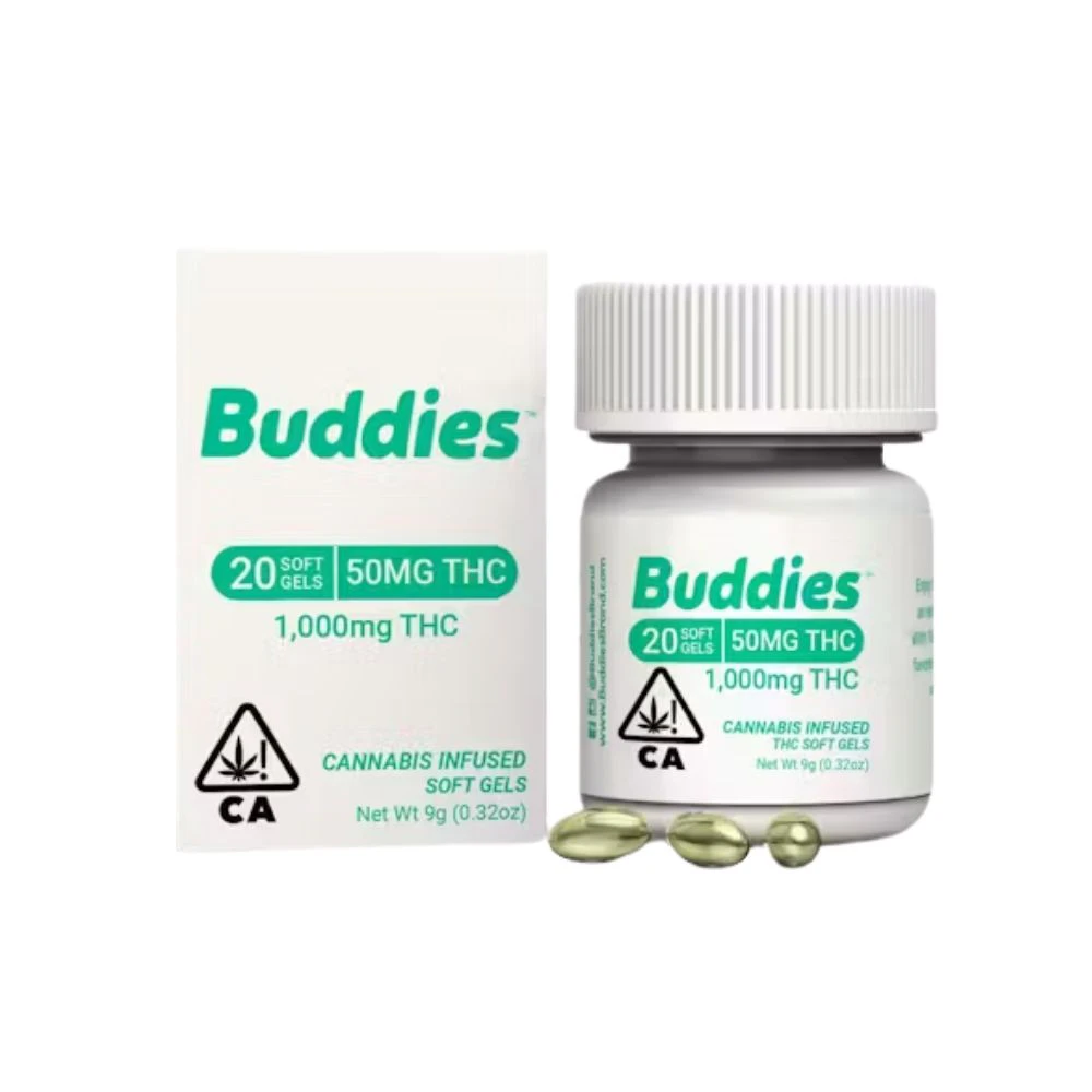 50mg Caps (20ct) - Buddies are concentrated pills that provide a convenient and effective way to consume cannabis. These pills, produced by BUDDIES, are perfect for those seeking a discreet and precise dosage. Each capsule contains 50mg of concentrated cannabis, ensuring a potent and consistent experience.