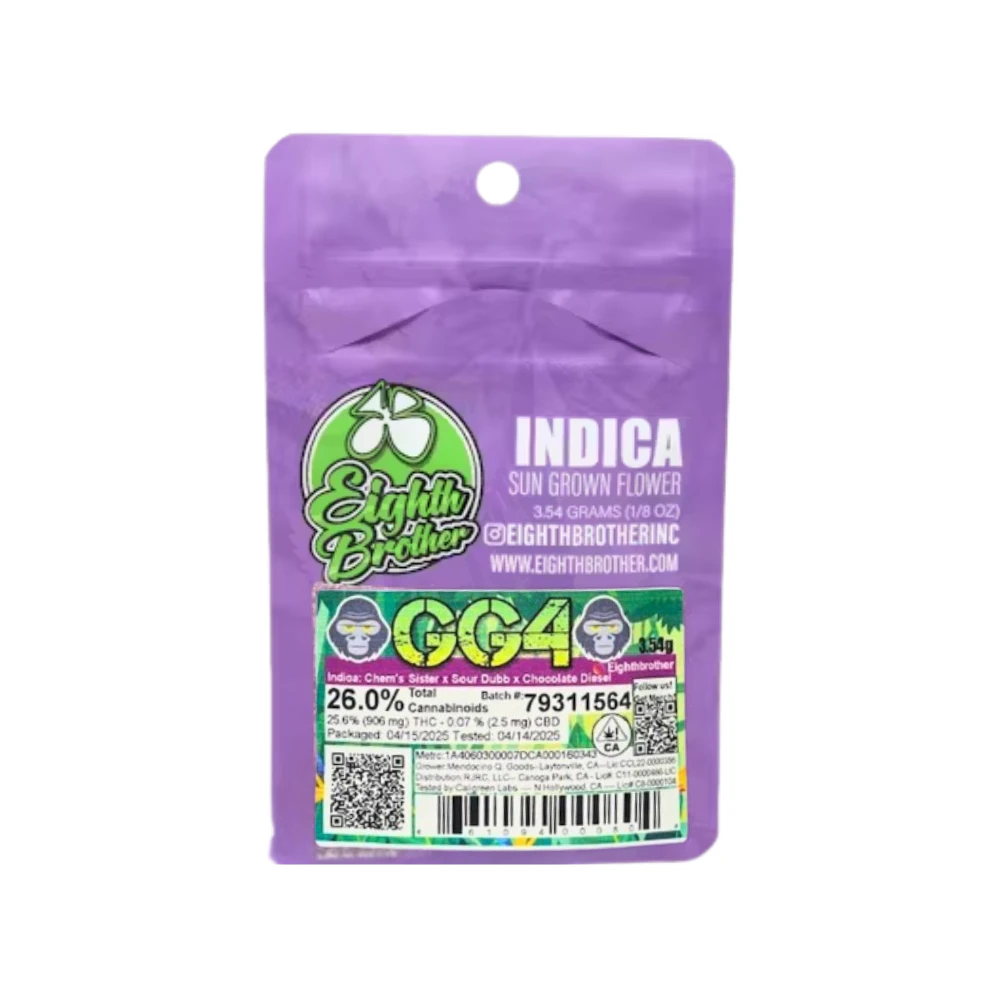 🦍💨 GG4 3.5G by Eighth Brother (aka Gorilla Glue #4) is a potent hybrid known for its heavy-hitting effects and sticky, resin-coated buds. A cross of Chem’s Sister, Sour Dubb, and Chocolate Diesel, GG4 delivers a powerful combination of euphoria and deep physical relaxation that lives up to its legendary reputation.