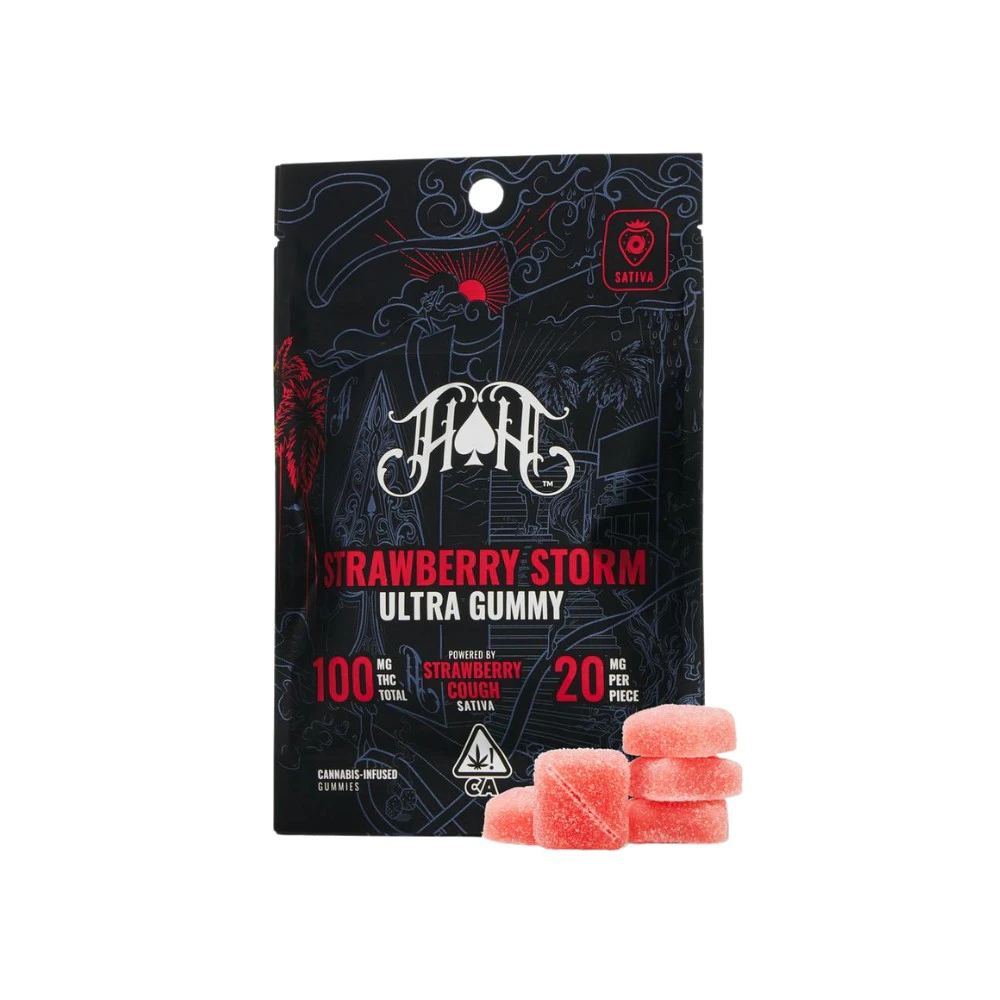 Strawberry Storm 100mg - Heavy Hitters is an edible that guarantees a euphoric experience with each delicious bite. These gummies are the epitome of potency, containing a powerful 20mg of THC per piece, divided into two convenient 10mg sections. Crafted using only the finest Ultra Pure and Ultra Potent concentrates, combined with custom terpene blends, these gummies deliver a targeted and intense experience like no other.