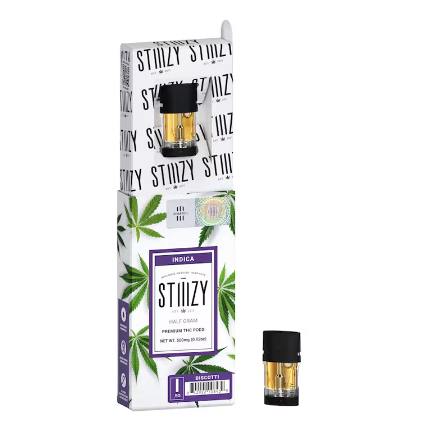 This is a discounted price for the Biscotti 0.5g cartridge by STIIIZY. Please note that all other discounts are excluded from this item. Extracted from a variety of natural flora, STIIIZY's botanically derived terpenes provide a balanced aroma and taste, ensuring a consistent experience every time. This premium quality concentrate sets the industry standard for purity, inspiring and influencing through innovative methods. Biscotti is an Indica-dominant strain resulting from the combination of Gelato #25 and South Florida OG. It offers a powerful body high and a delicious flavor. You can pick up this cartridge at From The Earth dispensary in Santa Ana, California, or have it conveniently delivered to your location. STIIIZY's Biscotti cartridge is perfect for those seeking an INDICA concentrate. **THIS ITEM IS DISCOUNTED + SOLD WITH AN OPTIONAL SEPARATE NON-CANNABIS MERCH ITEM -- IF YOU WOULD LIKE TO PURCHASE THE CANNABIS WITHOUT THE MERCH ITEM AT FULL PRICE -- PLEASE CONTACT US.**