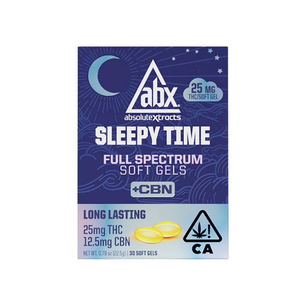 Sleepytime 25mg Soft Gels (30) - Absolute Extracts are precisely-dosed gel capsules containing 25mg of THC per pill. These soft gels, available at From The Earth dispensary in Port Hueneme, California, are formulated by ABSOLUTE EXTRACTS to promote restful slumber. Crafted with a potent THC concentrate and a supporting blend of terpenes, Sleepytime is an INDICA strain designed to aid in achieving a peaceful sleep. The premium distillate cannabis oil used in these soft gels is combined with high-quality coconut oil (MCT) to enhance absorption and provide optimal benefits. Convenient and easy to consume, Sleepytime Soft Gels offer a reliable and effective way to experience the calming effects of cannabis. Whether you prefer to pick it up in-store or have it delivered, Sleepytime Soft Gels are the perfect choice for those seeking a natural solution to sleep troubles.