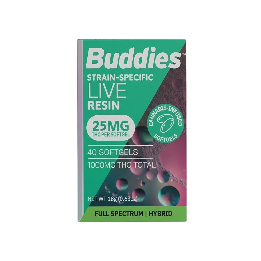 Liquid Diamonds - 25mg Hybrid Caps (40ct) - Buddies are pharmaceutical grade soft gels infused with Buddies strain-specific 100% live resin, providing a concentrated and well-rounded cannabis experience. These soft gels contain gelatin, glycerine, USP grapeseed oil, and cannabis extract as their ingredients. Each pill offers a full spectrum of cannabinoids and terpenes, ensuring a comprehensive hybrid experience.