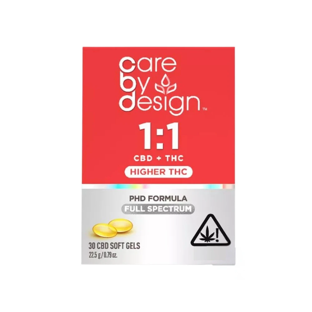 1:1 Soft Gels (30) - Care By Design is a hybrid concentrate in the form of convenient soft gel capsules. These capsules are designed to help you relax, soothe your body, recover from exercise, or promote a restful night's lethargy. Carefully formulated with a 1:1 ratio of full-spectrum cannabis, each soft gel contains equal parts CBD and THC, along with minor cannabinoids THCa and CBDa. With easy dosing and potent effects, the 1:1 ratio is one of our most popular choices. Whether you're an experienced cannabis user or simply seeking unwinding in the evening or a good night's lethargy, these soft gels are perfect for you. To enhance absorption in the body, we have included coconut oil in our formula. You can pick up these soft gels at From The Earth dispensary in Port Hueneme, California, or have them conveniently delivered to your doorstep.