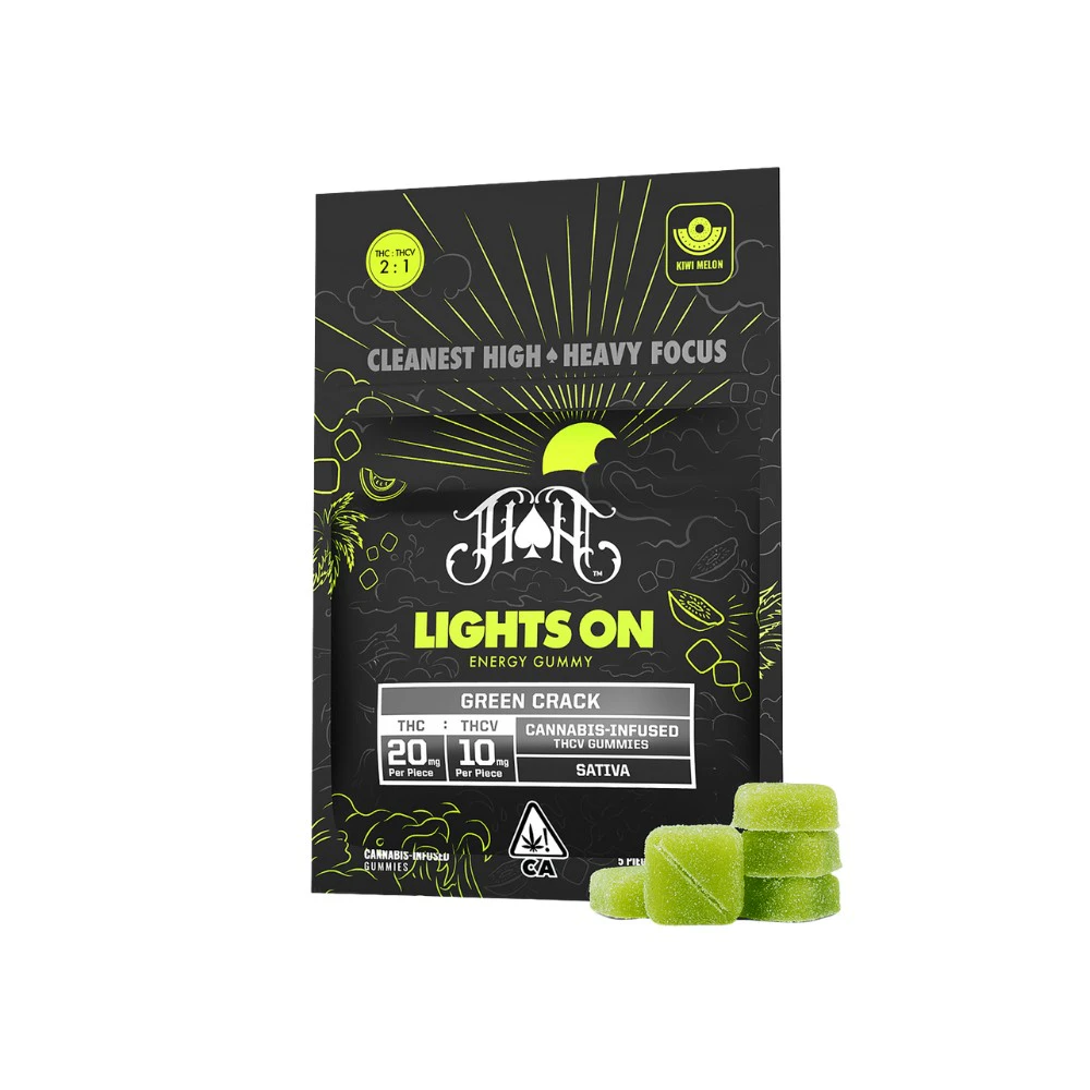 The THCV Green Crack 100mg gummy by Heavy Hitters is a powerful edible that will give you a high like no other. This lean, mean, green machine is designed to keep you hyped and energized without the pesky hunger pangs. Derived from the legendary Skunk #1 strain and an undisclosed landrace indica, Green Crack (also known as "Green Crush") is a potent and uplifting super-sativa. Each gummy is bursting with a refreshing kiwi and melon flavor, and contains a bold 2:1 ratio of THC to energizing THCv. With 30mg of total cannabinoids per piece, these gummies will have you soaring high and ready to conquer the day, all without the munchies. Plus, they are gluten-free, dairy-free, and nut-free. You can pick up this Heavy Hitters edible at From The Earth dispensary in Port Hueneme, California, or have it conveniently delivered to your doorstep.