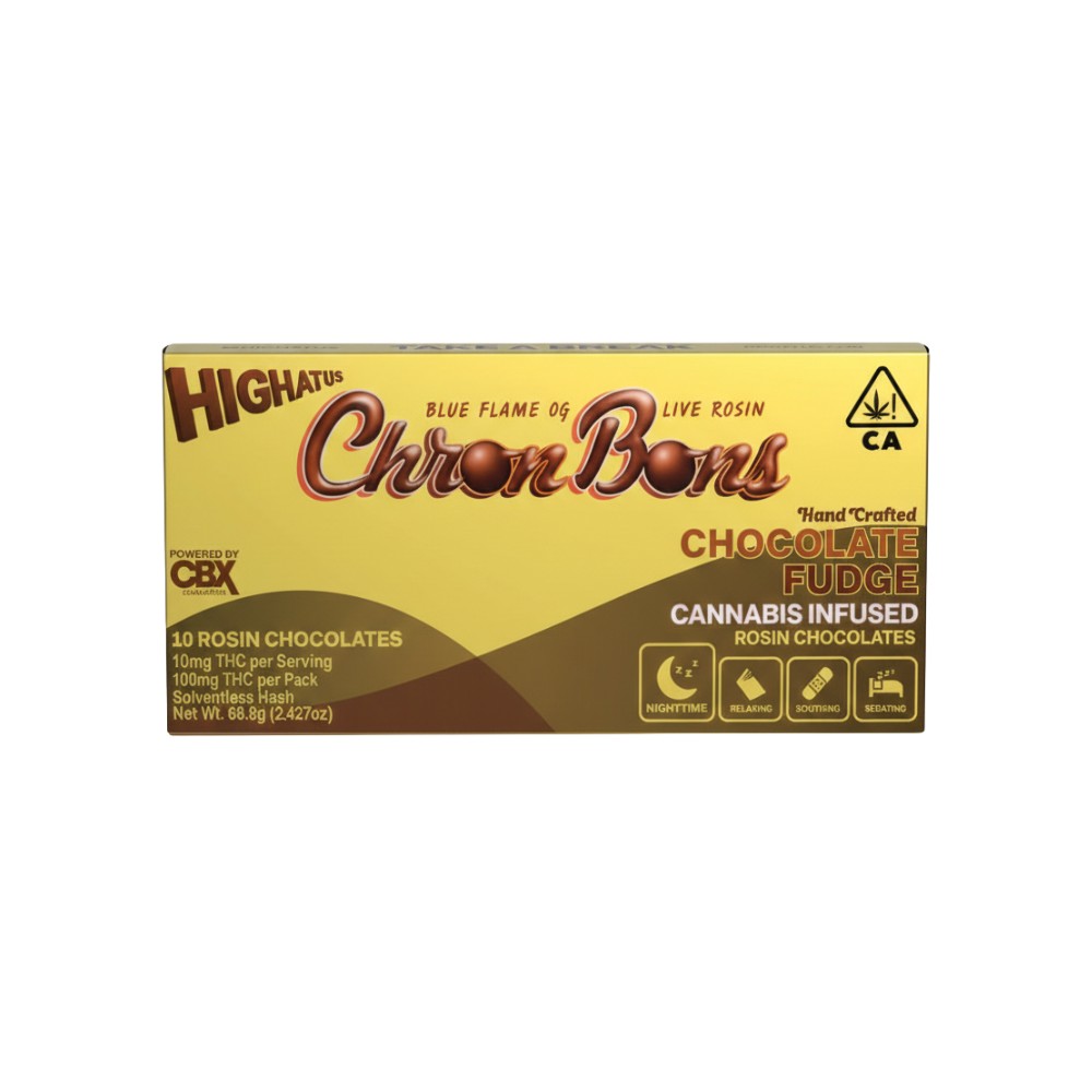 Indulge in the delectable CHOCOLATE FUDGE 100MG - CHRONBONS, a delightful edible available at From The Earth dispensary in Port Hueneme, California. These delectable treats are infused with solventless hash extracted from two renowned indica strains: Kush Mountains and White Walker OG. With a rich chocolate-on-chocolate flavor, these CHRONBONS offer a truly indulgent experience.