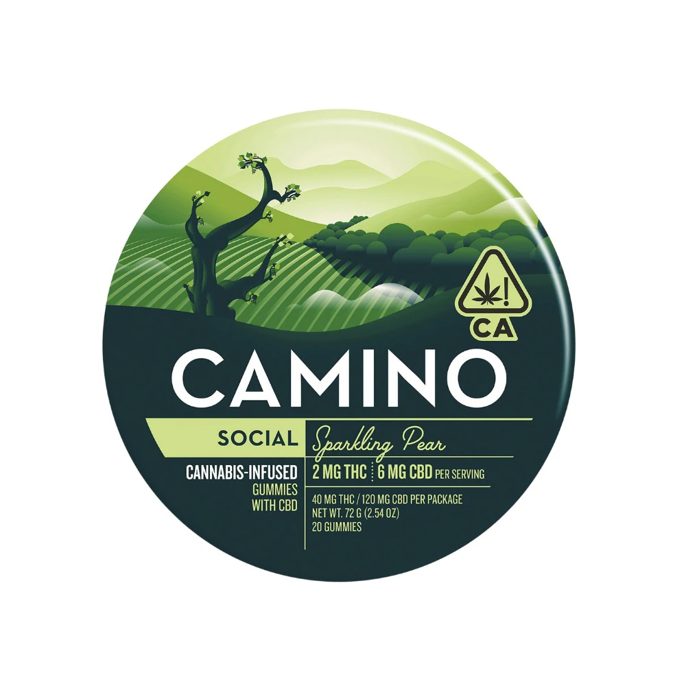 Camino - 1:3 Sparkling Pear by Kiva Confections is a delightful edible available at From The Earth dispensary in Port Hueneme, California. These pear-flavored gummies offer a unique 3:1 ratio of CBD to THC, providing a euphoric experience without any anxiety, leaving you feeling social and relaxed. Similar to a light moscato wine, these gluten-free and dairy-free gummies are perfect for those seeking a chill and happy vibe, making you ready to mingle. Each tin contains 20 gummies, with each gummy containing 6mg of CBD and 2mg of THC, resulting in a total of 120mg CBD and 40mg THC. Whether you prefer to pick it up in-store or have it conveniently delivered, Camino - 1:3 Sparkling Pear is a fantastic choice for anyone looking to enjoy the benefits of this hybrid edible by Kiva Confections. **THIS ITEM IS DISCOUNTED + SOLD WITH AN OPTIONAL SEPARATE NON-CANNABIS MERCH ITEM -- IF YOU WOULD LIKE TO PURCHASE THE CANNABIS WITHOUT THE MERCH ITEM AT FULL PRICE -- PLEASE CONTACT US.**