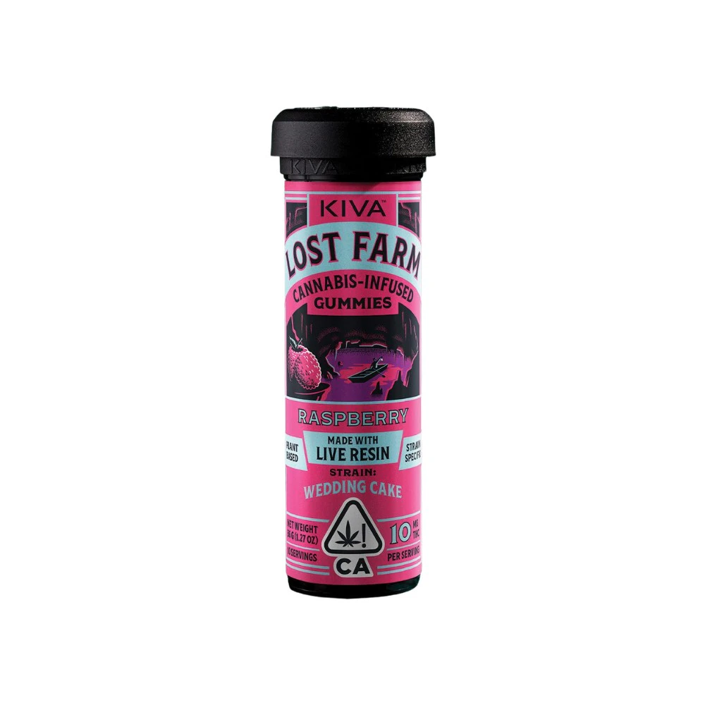 Lost Farm Gummies - Raspberry 100mg (Wedding Cake) by Kiva Confections is an edible infused with the delightful Wedding Cake strain. This hybrid edible offers a potent experience, with an indica-dominant profile that combines the tart fruitiness of Cherry Pie and the creamy vanilla sweetness of GSC. The gummy is further enhanced by earthy and peppery undertones, creating a well-rounded flavor profile.