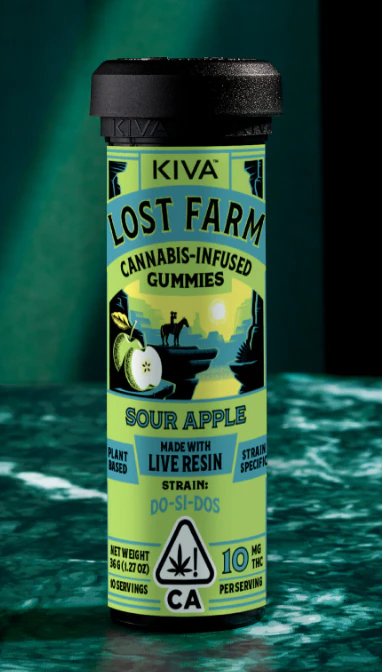 Lost Farm Gummies - Sour Apple 100mg (Do-Si-Do) by Kiva Confections is a delectable edible that combines the sweet, doughy, and nutty notes of the indica-dominant Do-Si-Dos strain with the refreshing tartness of green apple. This unique flavor profile offers a truly delightful gummy experience.