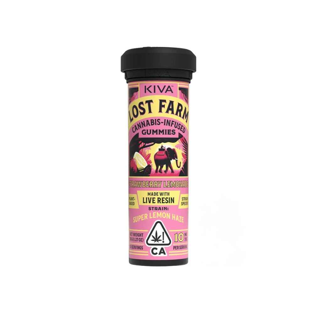 Lost Farm Gummies - Strawberry Lemonade 100mg (Super Lemon Haze) by Kiva Confections is a delectable fruit gummy that combines the earthy citrus flavors of Super Lemon Haze strain with the sweetness of strawberries and classic lemonade. This edible is a sativa-dominant hybrid blend of Lemon Skunk and Super Silver Haze, known for its sweet, tart, and earthy aroma. Made with "live resin," these plant-based gummies preserve the rich flavors, complex aromas, and broad terpene profiles of freshly-harvested cannabis flowers.