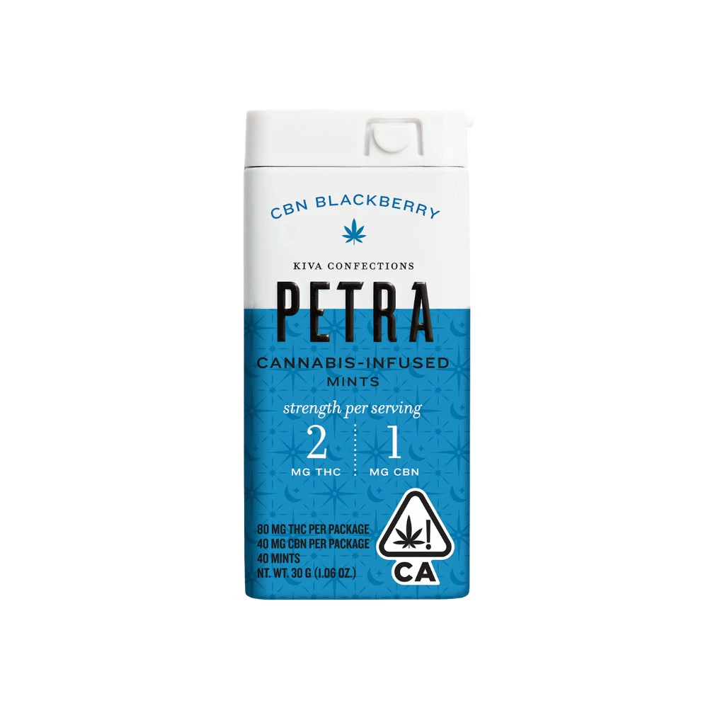 Petra Mints - CBN 2:1 Blackberry by Kiva Confections is a cannabis-infused edible that combines the benefits of THC and CBN to target your mood. This innovative mint not only delivers a pleasant THC buzz but also provides a soothing CBN sensation, making it perfect for winding down at night. Created by Kiva Confections in 2015, Petra Mints are discreet, portable, and precisely dosed, ensuring a consistent and enjoyable experience.