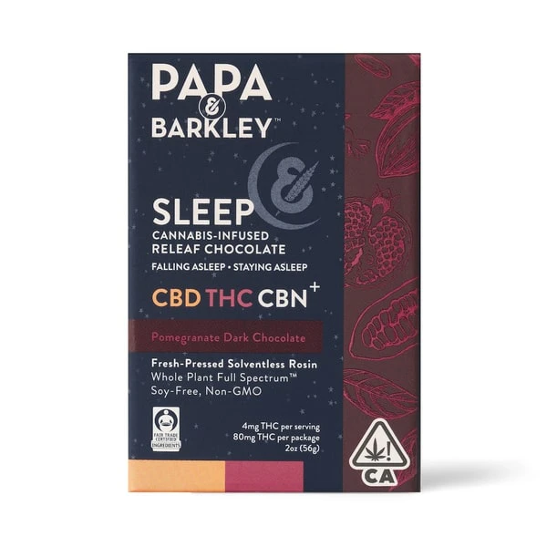 Papa & Barkley presents their indulgent Sleep - Pomegranate Dark Chocolate, an edible treat that delivers a restful night's sleep. This nighttime formula combines the perfect blend of CBD for relaxation, THC for comfort, and CBN for sedative effects. Each bar is designed to help you fall asleep, stay asleep, and wake up feeling refreshed. Made with clean, Fair Trade Certified™ ingredients and fresh-pressed cannabis rosin, this cannabis delicacy offers a sweeter nightly ritual without any chemicals.