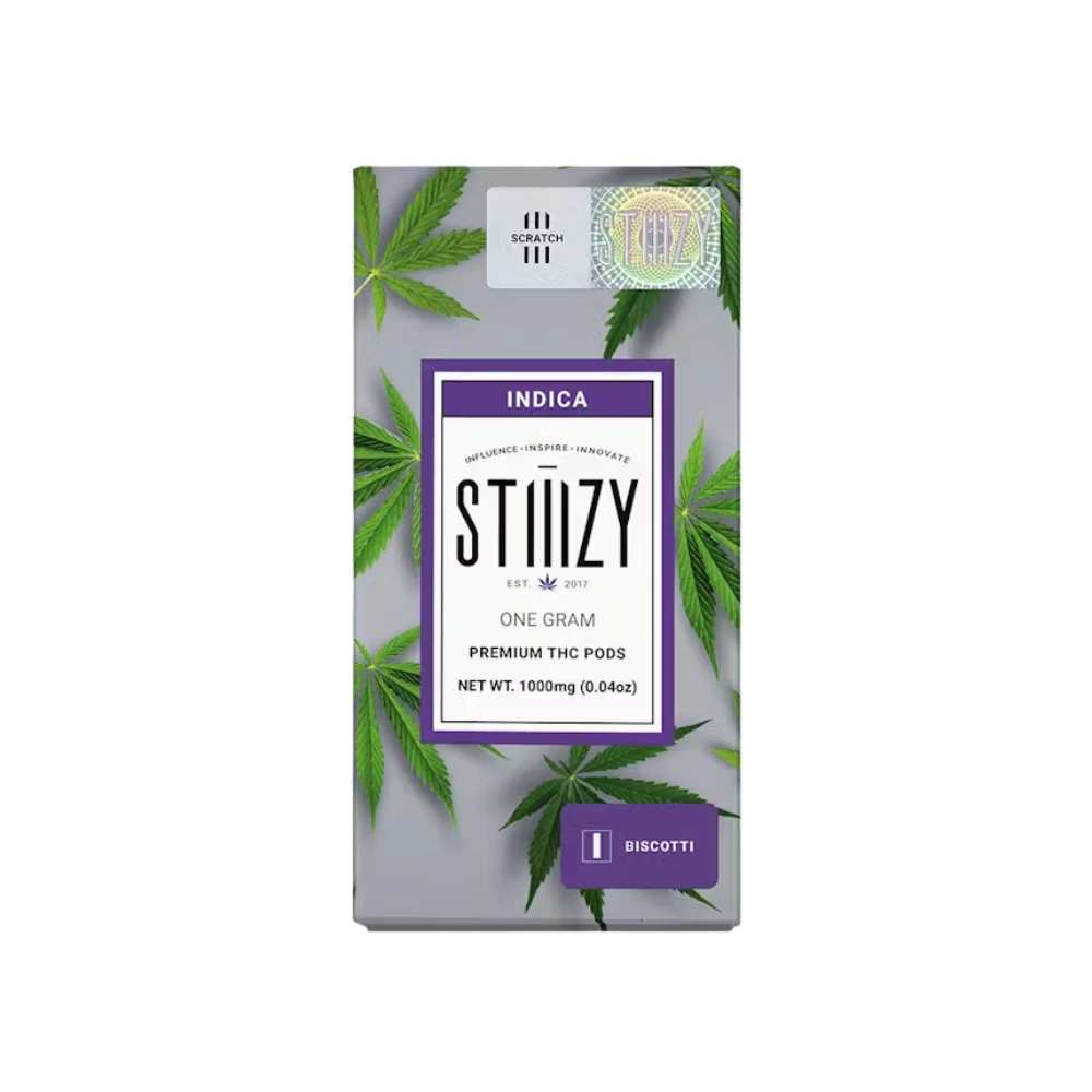 Experience the unique blend of Gelato #25 and South Florida OG with the Biscotti 1G cartridge by STIIIZY. Enjoy the relaxing effects and delightful flavor of this strain, all in a convenient and easy-to-use form. **THIS ITEM IS DISCOUNTED + SOLD WITH AN OPTIONAL SEPARATE NON-CANNABIS MERCH ITEM -- IF YOU WOULD LIKE TO PURCHASE THE CANNABIS WITHOUT THE MERCH ITEM AT FULL PRICE -- PLEASE CONTACT US.**
