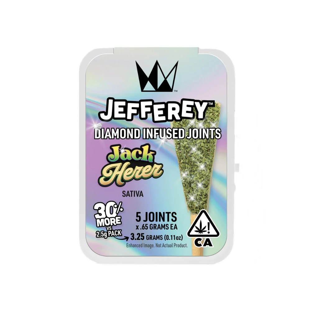 Jack Herer Jefferey 5-pack is crafted from a mysterious Haze strain, Northern Lights #5, and Shiva Skunk. A classic Sativa-dominant strain, these .65g mini J's are created from WCC’s top-shelf flower, a pinch of THCa diamonds, dusted with a layer of top-shelf kief, and covered with a discrete coating of all-natural terpenes. Ready to instill its uplifting and euphoric effects, the high provides a great mid-day motivator mixed with creative inspiration.