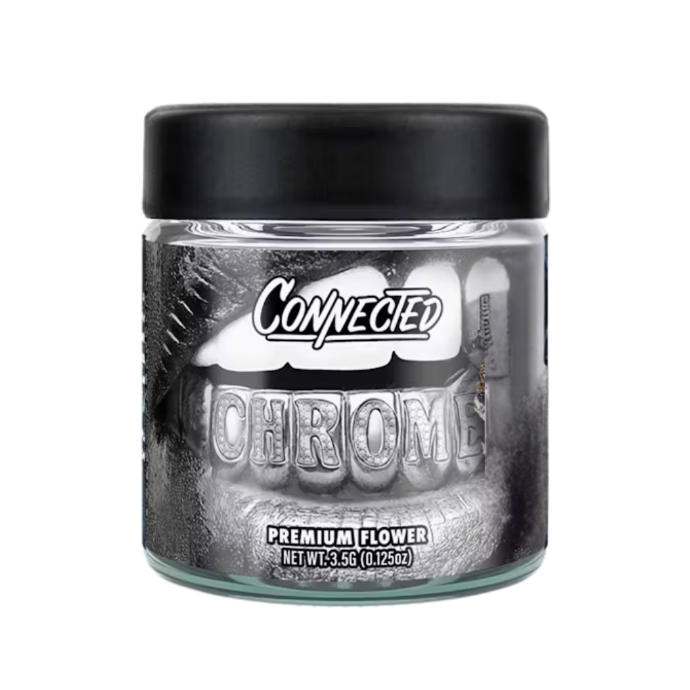 Step into the world of luxury cannabis with Chrome from Connected. These buds are a visual masterpiece, drenched in trichomes that shimmer like polished metal, showcasing deep green and purple hues under a silver sheen. It’s not just a treat for the eyes—Chrome delivers a bold flavor that hits all the right notes.