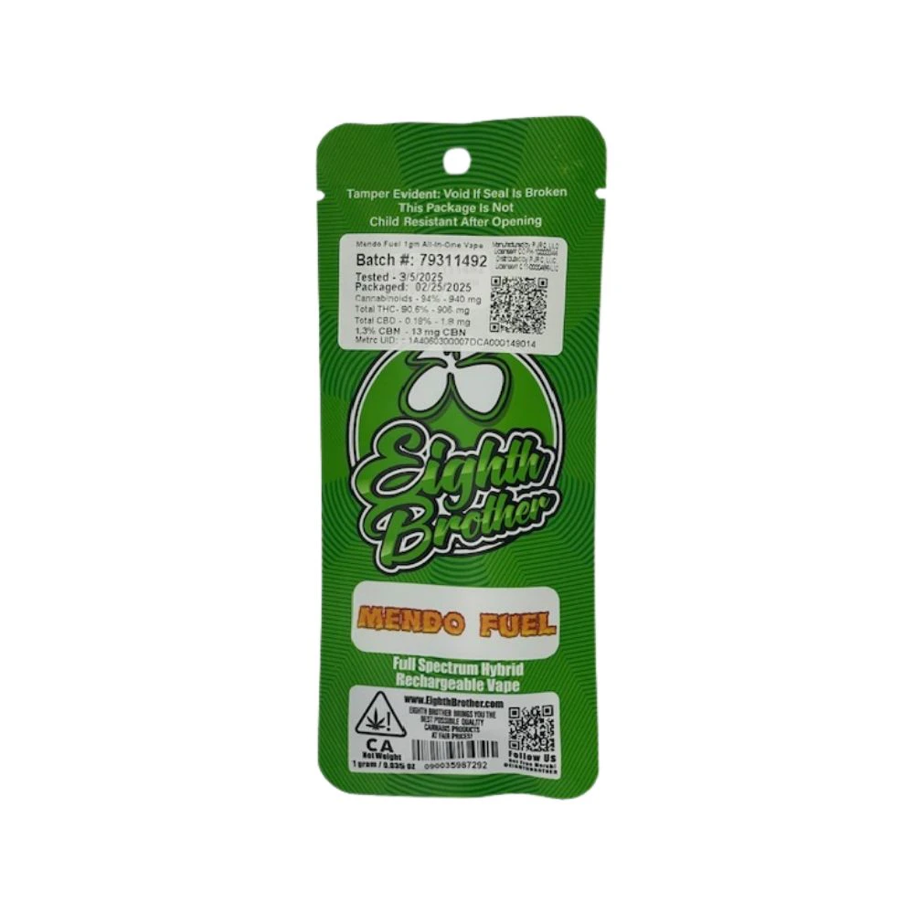 Our Mendo Fuel All-In-One Disposable 1G – Eighth Brother is the perfect way to enjoy premium cannabis in a sleek, convenient form. Featuring our high-potency distillate and expertly extracted true cannabis terpenes, this disposable vape delivers an authentic cannabis flavor without any artificial additives. Known for its rich, diesel-like aroma with earthy and piney notes 🌲, Mendo Fuel provides a smooth, euphoric high that's ideal for relaxing and unwinding. Rechargeable and stylish, it’s the perfect choice for your daily dose of Eighth Brother. Available now for pickup or delivery at From The Earth in Santa Ana, California 🚗✨—fuel your experience with Mendo Fuel.