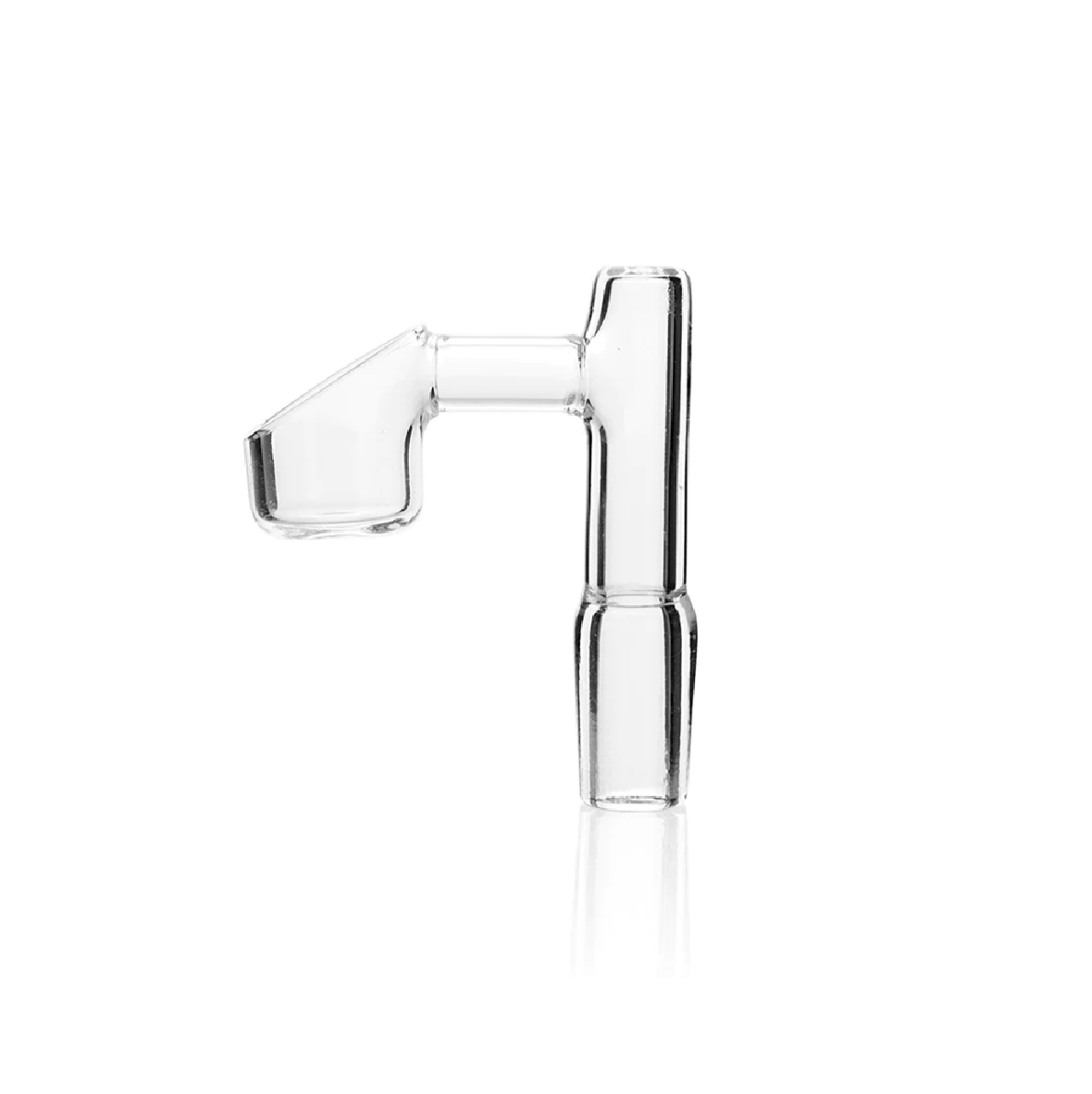 The 14mm GRAV® Male Banger is compatible with any 14mm female joint and made of heat-tolerant quartz. Its flat dish is designed for vaporizing plant extract, and its 90° angled neck is best paired with straight-based water pipes.