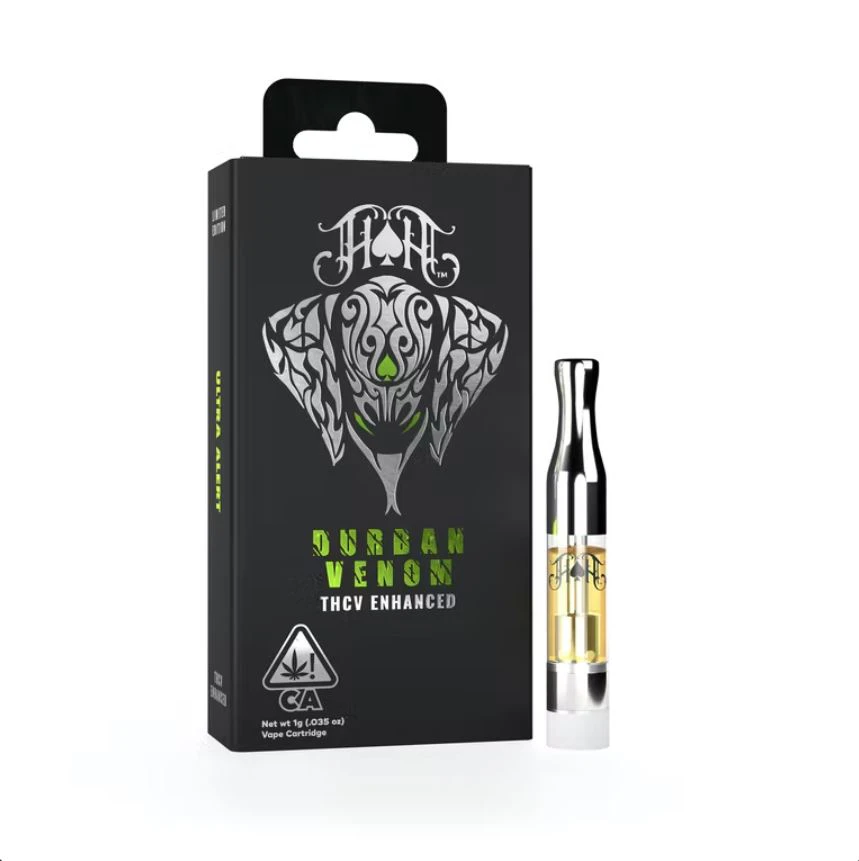 Durban Venom THCV 1g by Heavy Hitters is a discounted price item that excludes all other discounts. This potent strain combines the classic super sativa Durban Poison with a bold bite of energizing THCV, resulting in a product that may enhance focus and alertness. Perfect for the active smoker, Durban Venom is designed to amplify energy and productivity. With a balanced 3:1 ratio of THC to THCV, this rare cannabinoid is known to boost energy levels. Welcome to Wake n' Bake 2.0! Durban Venom has a sativa strain type, providing an energetic, creative, and focused effect profile. Its taste profile is herbal, piney, and sweet. This strain is derived from a landrace sativa native to South Africa. You can conveniently pick up this cartridge at From The Earth dispensary in Santa Ana, California, or have it delivered to your doorstep.