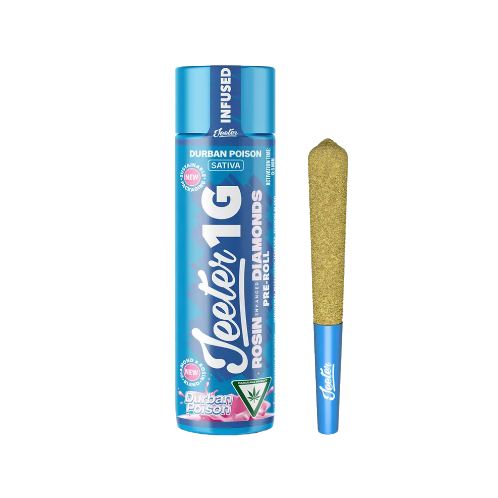 🌿⚡ Durban Poison Rosin Infused 1G by Jeeter is a pure sativa classic that hits with bright, sweet, and earthy notes in every puff. Infused with high-quality rosin, this 1-gram pre-roll delivers an energetic, uplifting experience that sharpens focus, sparks creativity, and keeps your mood elevated. Perfect for daytime adventures, artistic sessions, or anytime you need a clear, euphoric boost.