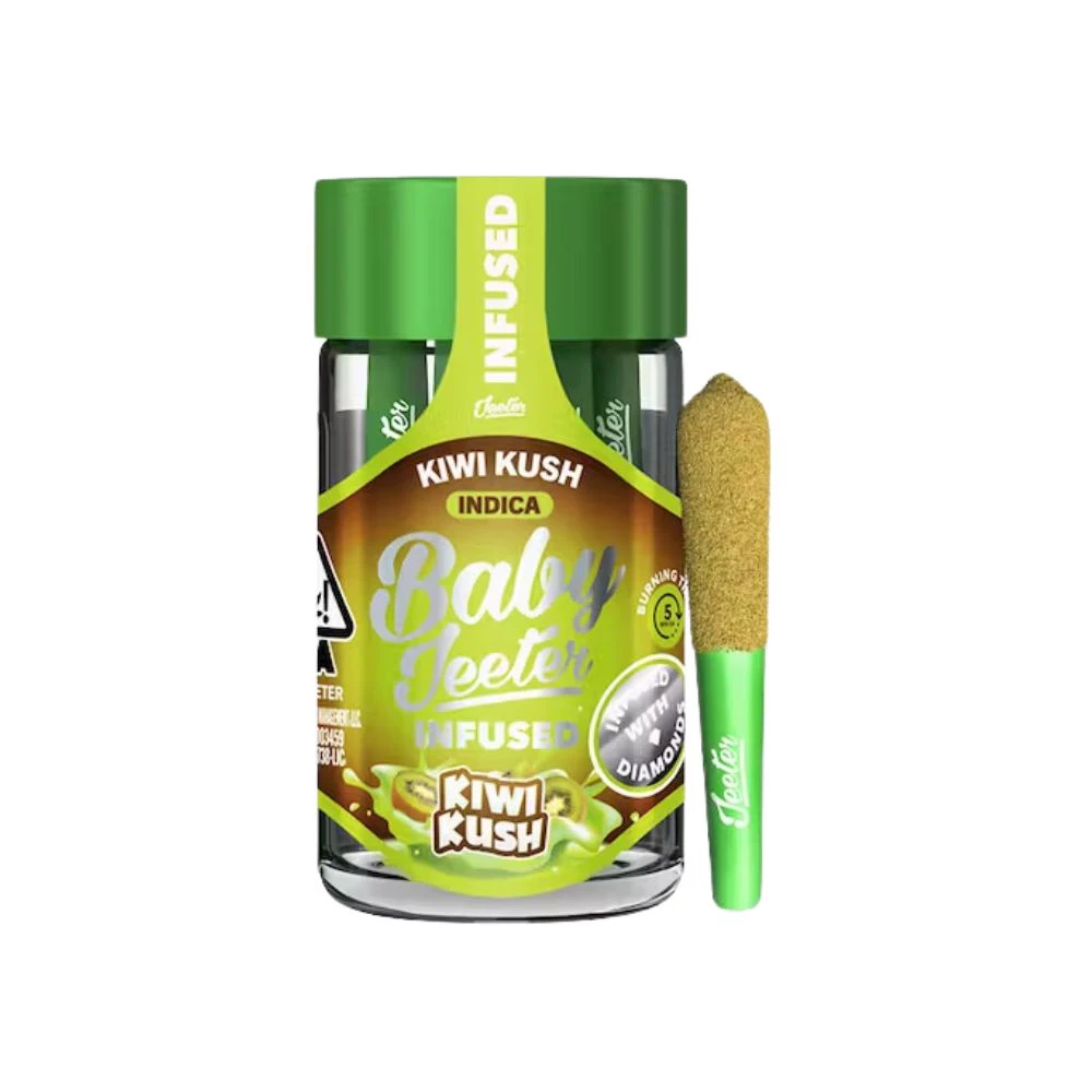 Introducing Kiwi Kush Baby Jeeter Infused: a delightful blend of citrus, fruit, and earthiness, grown indoors with 40.23% THC. Unwind with 5 flavorful 0.5g joints, totaling 2.5g. This indica promises a relaxing, social experience—perfect for evenings with friends and family. Embrace the fruity vibes and sink into Kiwi Kush! 🥝💨