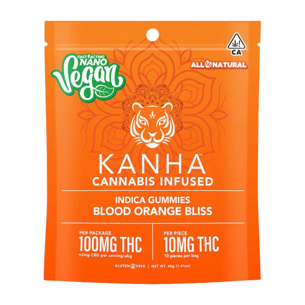 Kanha Nano Vegan presents the Indica Blood Orange Bliss, a delightful edible that combines the benefits of nanomolecular technology with a vegan base. These gummies are not only delicious but also fast-acting, thanks to the use of cannabinoid particles that are smaller than a wavelength of light. On average, you can expect to feel the effects within 10-20 minutes. The Blood Orange Bliss gummies are juicy and sweet, made with Indica terpenes that induce a calm and relaxed state of mind. The soft texture that is a signature of Kanha products is maintained in these gummies. This edible is a product of Kanha, a trusted name in the industry. You can pick up the Indica Blood Orange Bliss at the From The Earth dispensary in Santa Ana, California. Alternatively, you can also opt for delivery if that is more convenient for you. Enjoy the unique blend of taste and relaxation with the Indica Blood Orange Bliss from Kanha Nano Vegan.