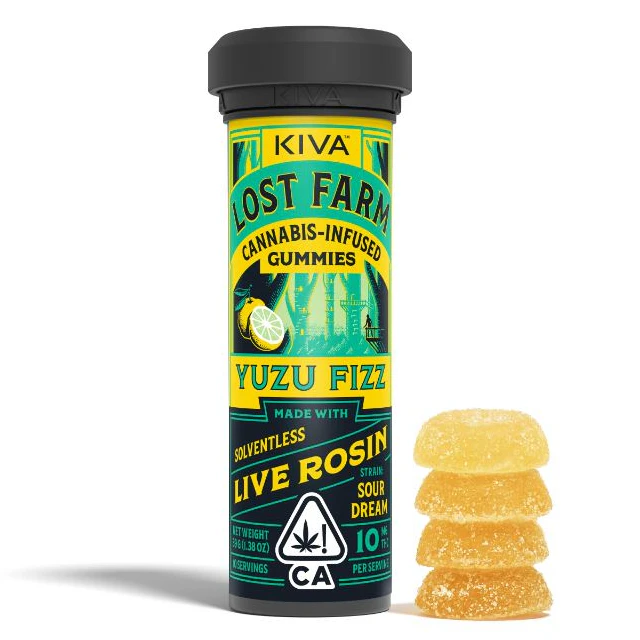 Lost Farm - Yuzu Fizz Rosin Gummies 100mg by Kiva Confections are a delightful edible option for cannabis enthusiasts. These sativa-dominant gummies offer a unique combination of earthy flavors with a touch of lemony citrus and a hint of yuzu tartness. Each package contains 10 servings, with each gummy containing 10mg of THC.