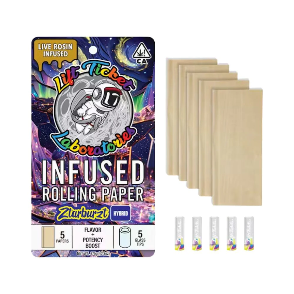 Immerse yourself in the vibrant essence of Ztarburzt with Lift Tickets' 5 pack of Live Resin Infused Rolling Papers, complete with 5 sleek glass tips for a top-notch smoking experience. 🌟✨ Each rolling paper is infused with Ztarburzt live resin, highlighting its zesty terpene profile rich in limonene, caryophyllene, and myrcene.