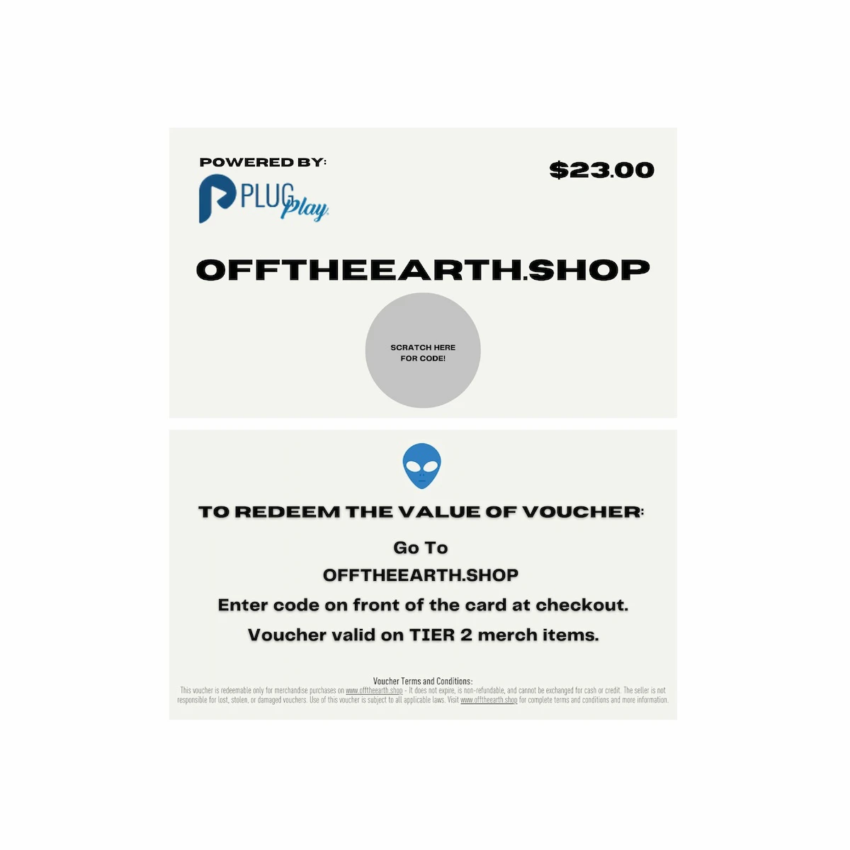 Unleash your shopping spree with Off the Earth Coupon Vouchers! Redeem these cards at OFFTHEEARTH.SHOP on a selection of unique accessories. Off the Earth offers a handpicked collection that’s out of this world. Perfect for gifting or treating yourself to something truly extraordinary! ✨ Ready to explore? The adventure starts now with your Off the Earth Voucher 🌎🛍 **NOT REDEEMABLE ON FROMTHEEARTH.COM** ***THIS VOUCHER SI REDEEMABLE ONLY FOR MERCHANDISE PURCHASES ON WWW.OFFTHEEARTH.SHOP - IT DOES NOT EXPIRE, IS NON-REFUNDABLE, AND CONOT BE EXCHANGED FOR CASH OR CREDIT. THE SELLER IS NOT RESPONSIBLE FOR LOST, STOLEN, OR DAMAGED VOUCHERS. USE OF THIS VOUCHER IS SUBJECT TO ALL APPLICABLE LAWS. VISIT WWW.OFFTHEEARTH.SHOP FOR COMPLETE TERMS AND CONDITIONS AND MORE INFORMATION***
