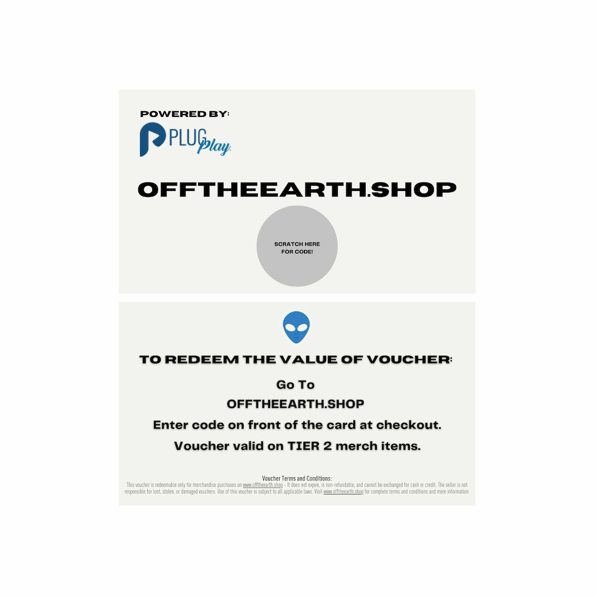 Unleash your shopping spree with Off the Earth Coupon Vouchers! Redeem these cards at OFFTHEEARTH.SHOP on a selection of unique accessories. Off the Earth offers a handpicked collection thatโ€™s out of this world. Perfect for gifting or treating yourself to something truly extraordinary! โœจ Ready to explore? The adventure starts now with your Off the Earth Voucher ๐ŸŒŽ๐Ÿ› **NOT REDEEMABLE ON FROMTHEEARTH.COM** ***THIS VOUCHER SI REDEEMABLE ONLY FOR MERCHANDISE PURCHASES ON WWW.OFFTHEEARTH.SHOP - IT DOES NOT EXPIRE, IS NON-REFUNDABLE, AND CONOT BE EXCHANGED FOR CASH OR CREDIT. THE SELLER IS NOT RESPONSIBLE FOR LOST, STOLEN, OR DAMAGED VOUCHERS. USE OF THIS VOUCHER IS SUBJECT TO ALL APPLICABLE LAWS. VISIT WWW.OFFTHEEARTH.SHOP FOR COMPLETE TERMS AND CONDITIONS AND MORE INFORMATION***