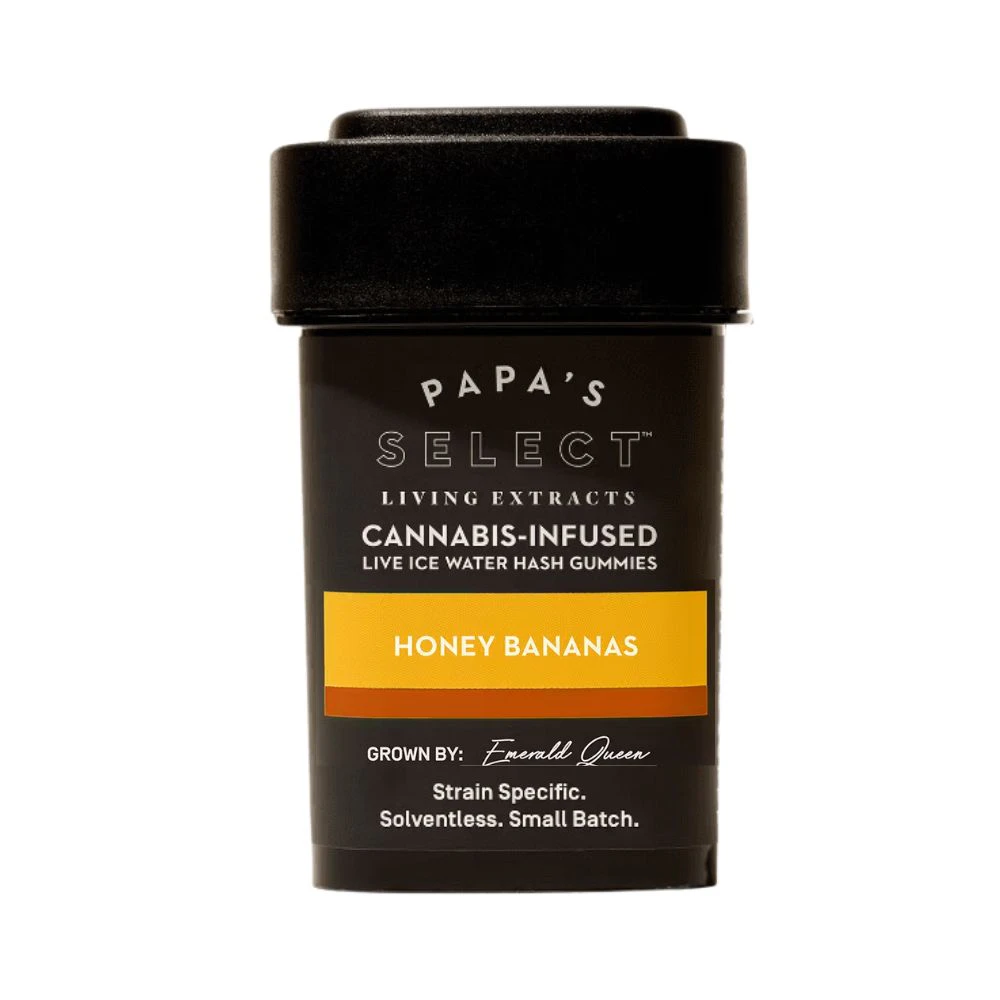 Papa's Select Honey Bananas Ice Water Hash Gummies are a delightful edible offering from Papa & Barkley. These gummies are made with the Honey Bananas is grown by Emerald Queen Farms. The Honey Bananas strain is a cross between Strawberry Banana and Honey Boo Boo and receives its name from its unmistakable banana flavor. With your first bite you will taste the rich banana flavor followed by a delicious honey after taste. We let the strains natural flavor profile speak for itself in this gummy so no additional flavors are added. You can pick up these edibles at the From The Earth dispensary in Santa Ana, California, or have them delivered for your convenience. Experience the true-to-the-living-flower experience with Papa's Select Papaya Punch Ice Water Hash Gummies.