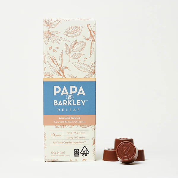 Papa & Barkley's Releaf Caramel Filled Milk Chocolates are a delicious and enjoyable edible option for cannabis enthusiasts. These chocolates are Fair Trade Certified, ensuring ethical sourcing and quality. Each piece is filled with silky caramel and made with solventless rosin, providing a taste experience you'll crave. Each bite contains 10mg of cannabinoids, with a total of 100mg per package. To use, simply enjoy one piece of chocolate and wait two hours for the full effect before considering an increased dose. Remember to store your chocolates in a cool, dry place to maintain their quality. You can conveniently pick up these edibles at the From The Earth dispensary in Santa Ana, California. Alternatively, you can opt for delivery if that suits your needs better. Please note that this product is an edible, not a flower, preroll, cartridge, or extract strain. Enjoy responsibly.