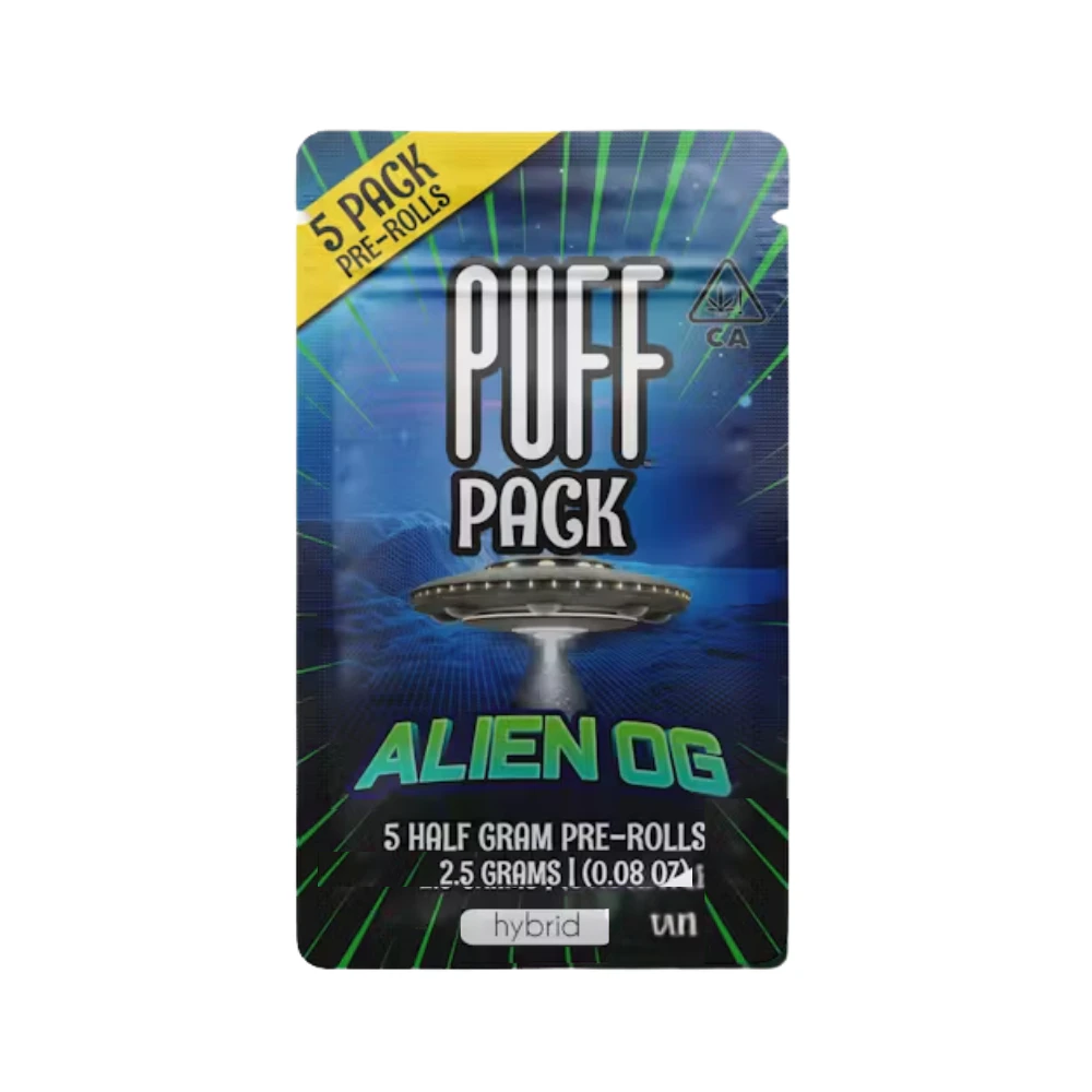 👽💨 Prepare for liftoff with Alien OG (5PK) by Puff! This pack of premium prerolls features the renowned Alien OG strain, known for its out-of-this-world potency and invigorating effects. Each preroll delivers a cosmic blend of piney and citrus notes, layered with earthy undertones that elevate the smoking experience.