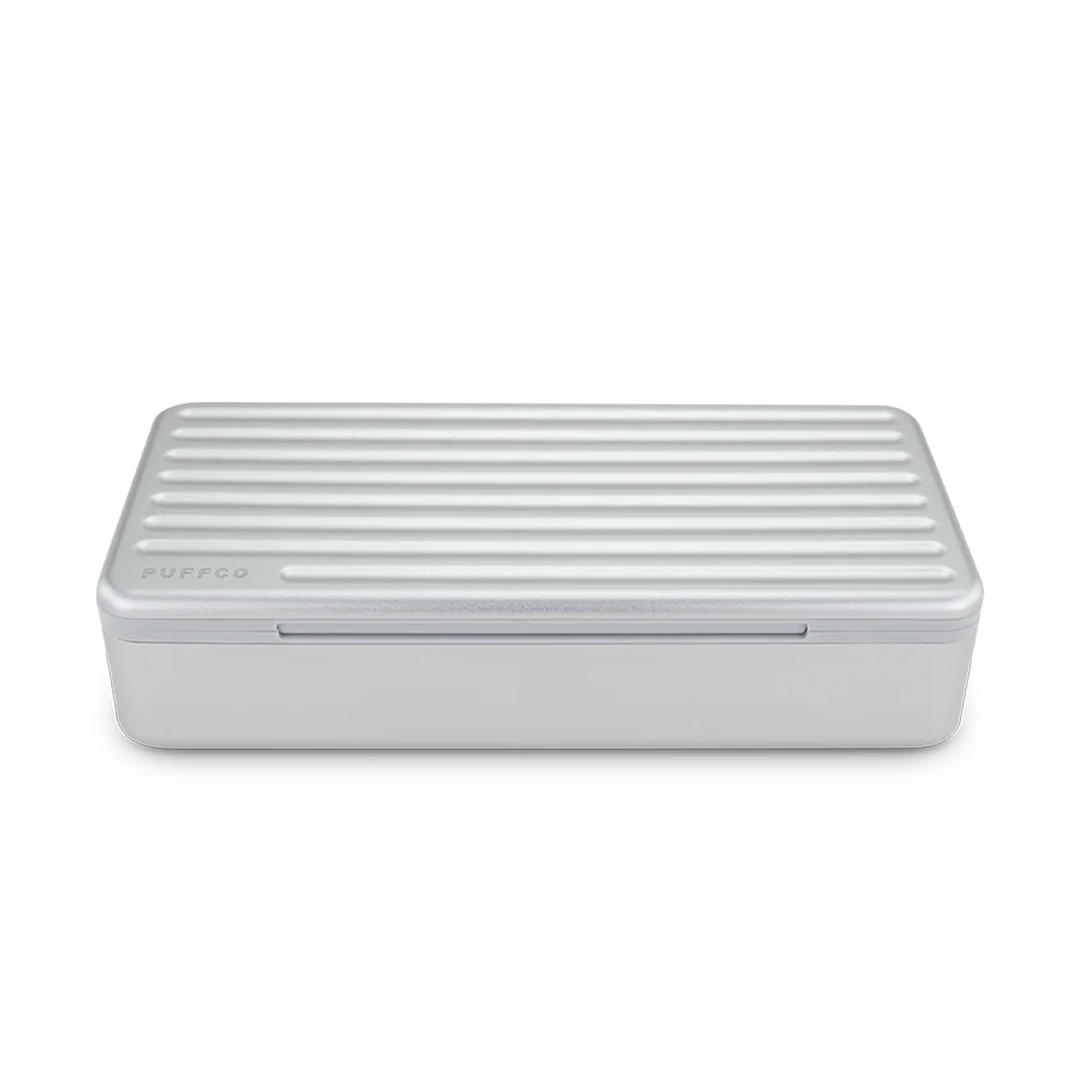 🌿💼 The Aluminum/Silicone Pivot Travel Case – Puffco is the perfect solution for keeping your gear organized and protected while on the go. With a ridged aluminum exterior, this travel case offers both durability and style. The magnetic lid closure ensures a secure fit, while the soft silicone interior helps reduce rattling, keeping everything in place during transport.