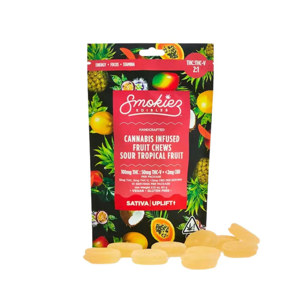 Get ready for a zesty, tropical explosion with 2:1 THCV Sour Tropical Fruit Chews by Smokiez! These chews combine the best of both worldsโsour, tangy tropical flavors and the energizing benefits of THCV, for a perfect, mood-boosting experience. Think of a tart blend of pineapple, lime, and passionfruit, delivering a mouth-puckering twist with every bite!
