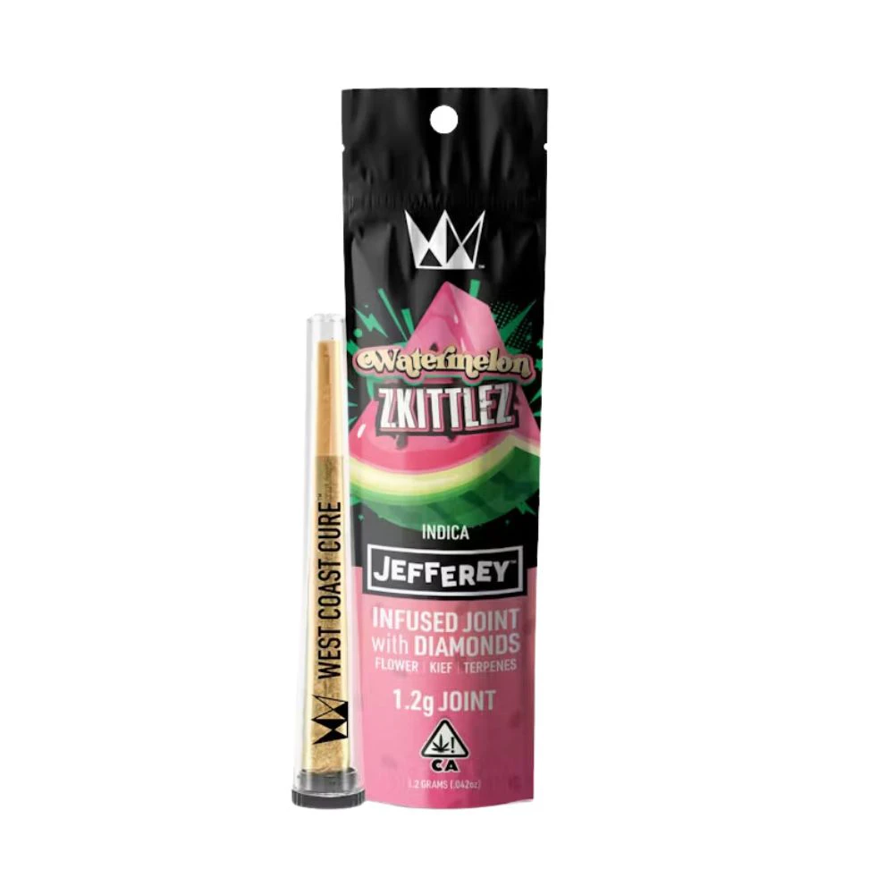 Experience the blissful taste sensation of Watermelon Zkittlez Jeffrey Single—a delightful fusion of flavors awaits! 🍉🌈 Crafted from our whole nug buds, these 1.2g joints are bursting with the essence of sweet berries and tropical notes. Infused with potent THCa diamonds and enriched with kief from our Top Shelf Flower, each joint creates a relaxed vibe-shift that's subtle, satisfying, and harmonious. 🌿✨