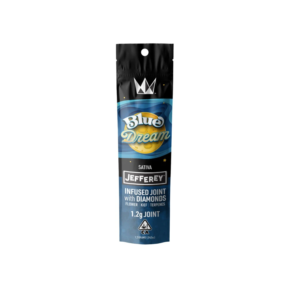 West Coast Cure presents Blue Dream Jefferey Infused Joint, a preroll crafted for discerning individuals with an elevated tolerance. This .65g Sativa-leaning preroll offers kaleidoscopic effects and a delightful blueberry haze palate. Made from our perfectly cured Premium Flower, this preroll is loaded with Live Resin Diamonds and dusted with kief from our Top Shelf Flower, resulting in a truly exceptional experience. Enriched with a subtle coating of all-natural terpenes, the effects of the Blue Dream Jefferey Infused Joint are nothing short of exhilarating. Conveniently available in packs of 5, this preroll is perfect for those seeking a top-notch cannabis experience.