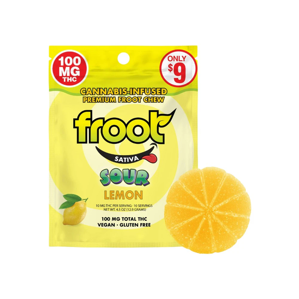 Single - Sour Lemon 100mg - Froot is an edible infused with the invigorating Sativa strain. Bursting with tangy citrus flavors, this delectable treat is perfect for those seeking a refreshing and uplifting experience. Each piece contains 100mg of THC, ensuring a potent and enjoyable journey.
