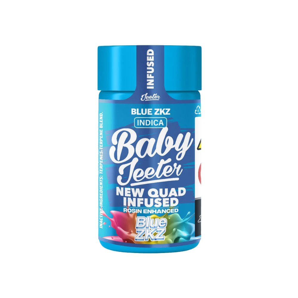 The Baby Jeeter 5 Pack Infused - Blue Zkittlez .5g - Jeeter is infused with distillate oil and kief, enhancing its potency and flavor. With a mood-boosting effect, this strain will leave you feeling relaxed, happy, and hungry. It's the perfect choice for winding down after a long day or simply indulging in some well-deserved relaxation.