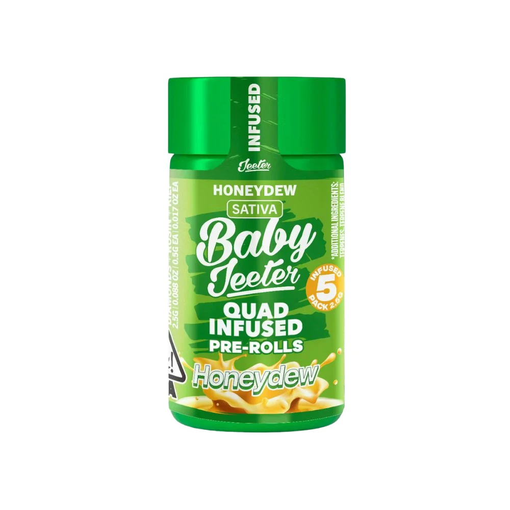 Baby Jeeter 5 Pack Infused - Honeydew .5g - Jeeter is a sativa preroll that offers a delightful smoking experience with its deliciously fruity and berry-packed flavors. This strain is a cross between Mazar-I-Sharif and Cinderella 99, resulting in a sweet profile that combines melon, citrus, and mangoes. The euphoric effects of Baby Jeeter are as memorable as its taste, providing blissful and unfocused joy while effectively treating depression and anxiety.