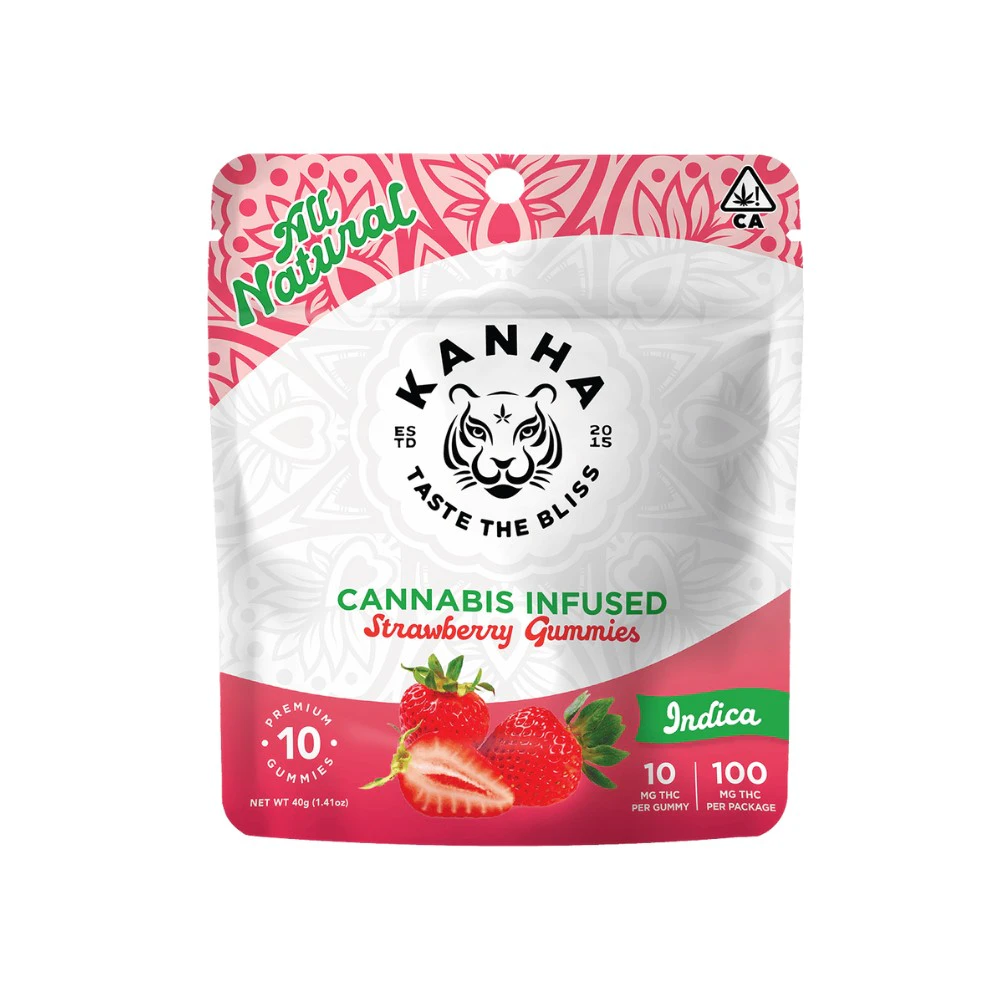 Indica - Strawberry 100mg - Kanha is an edible product that offers a delightful cannabis experience. Each bag contains 10 gummies, with each gummy infused with the highest quality cannabis oils, ensuring a consistent and safe experience. Made with all-natural ingredients, coloring, and flavoring, these gummies are a delicious treat. The Strawberry flavor is satisfyingly sweet and infused with indica terpenes, known for inducing a calm and relaxed state of mind.