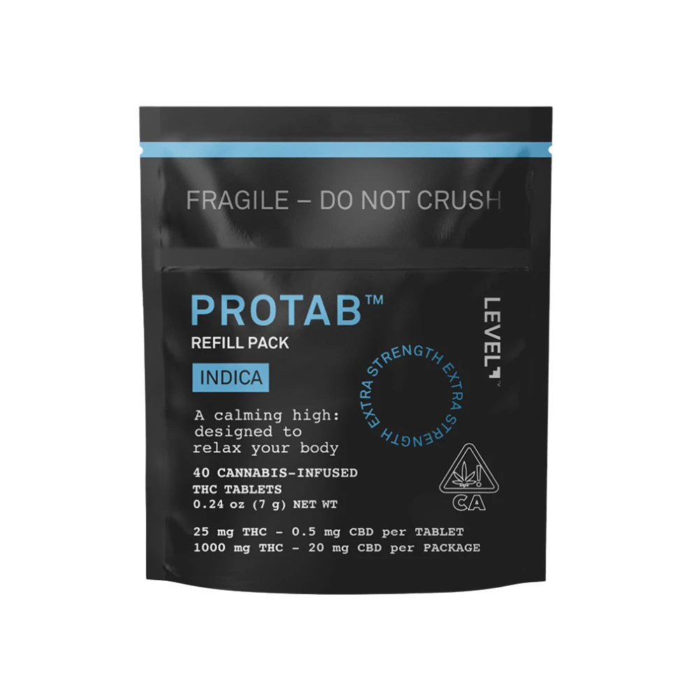 If you're a fan of indulging in the best, then the Indica Protab Refill Pack from LEVEL BLENDS is perfect for you. This edible refill pack contains 40 tablets, each packed with 25 mg of THC. Within 30-90 minutes, you'll start to feel the effects, which can last for 2-4 hours. For those seeking a milder experience, these tablets are conveniently scored, allowing you to easily split them in half.