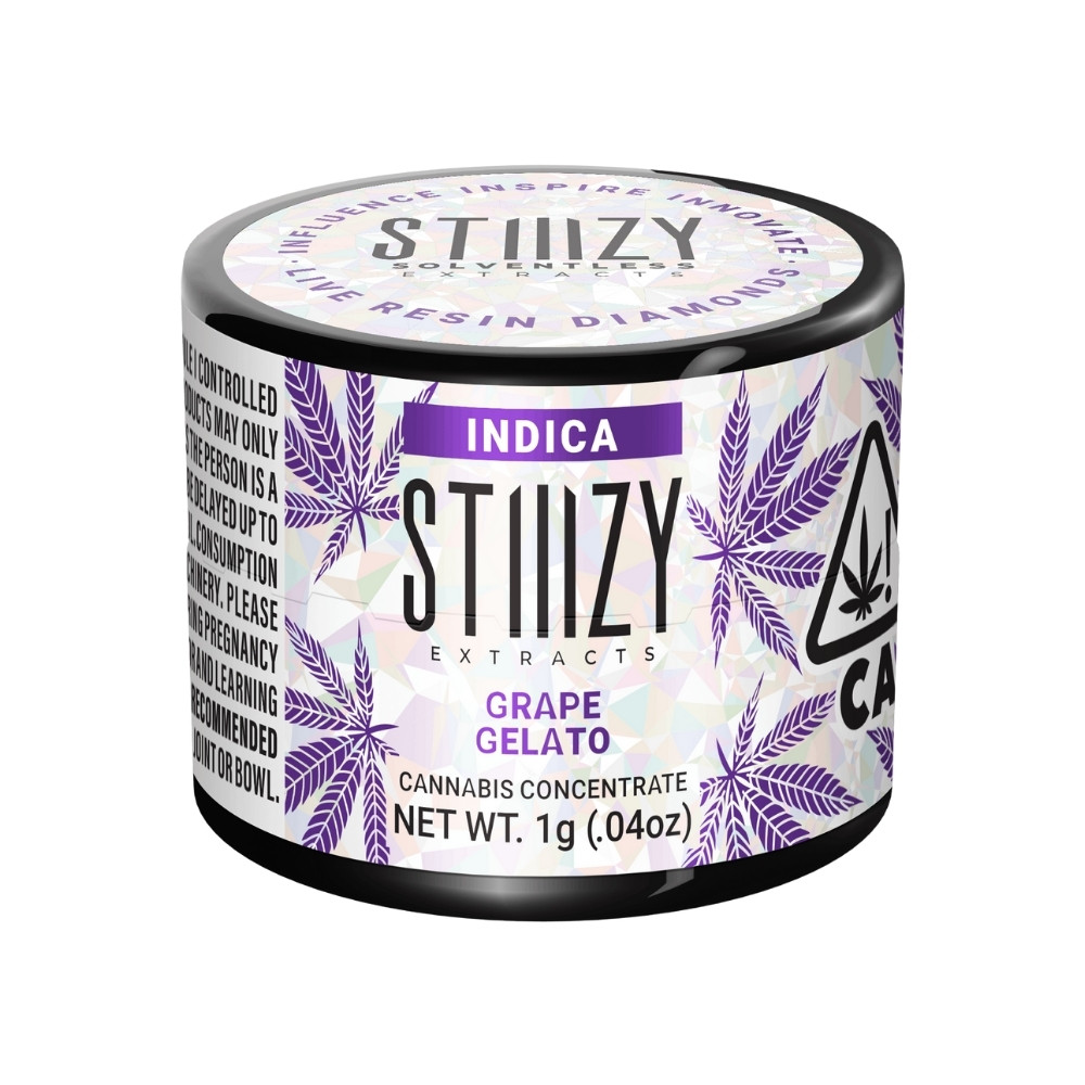 Live Resin Diamonds - Mochi Gelato 1g - STIIIZY is an extract strain that combines the best of Sunset Sherbet and Thin Mint Girl Scout Cookies. Bred by San Francisco's Sherbinskis, this strain is also known as Mochi, Mochi Gelato, and Gelato 47. Its flavor profile, as described by Sherbinskis, resembles the fruity and sweet taste of the Japanese frozen dessert, with a subtle hint of mint. The strain's aroma is a delightful blend of floral scents and earthy undertones, complemented by a touch of vanilla. You can find this exceptional extract at From The Earth dispensary in Port Hueneme, California. Whether you prefer to pick it up in person or have it conveniently delivered, STIIIZY ensures a high-quality product that captures the essence of Mochi Gelato. Experience the unique flavors and effects of this strain, expertly crafted to provide an enjoyable and satisfying experience.