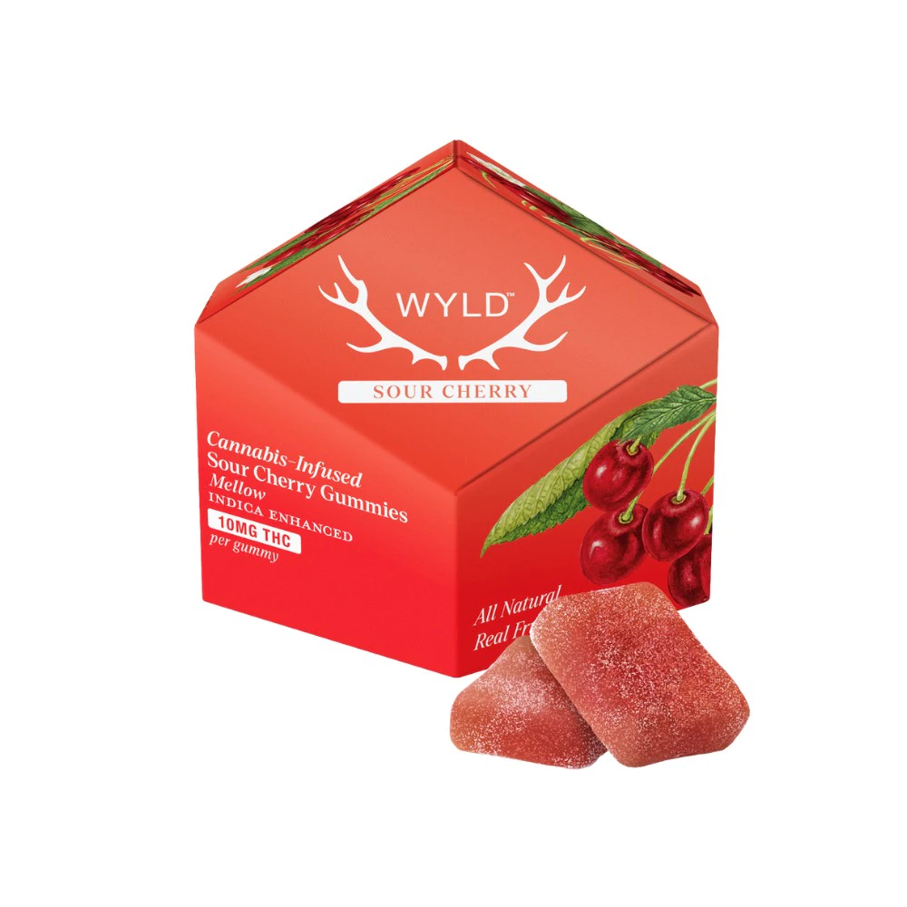 Indica Sour Cherry 100mg - Wyld is an edible that offers a discounted price exclusively for this item, excluding all other discounts. Created by Wyld, these Sour Cherry Indica Enhanced gummies are perfect for unwinding after life's adventures. Made with real fruit and botanical terpenes, these gummies deliver a tart twist that will surely satisfy your taste buds. It's like a cozy hammock for your inner thoughts.